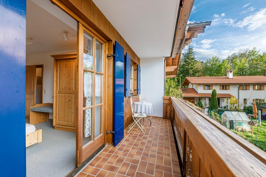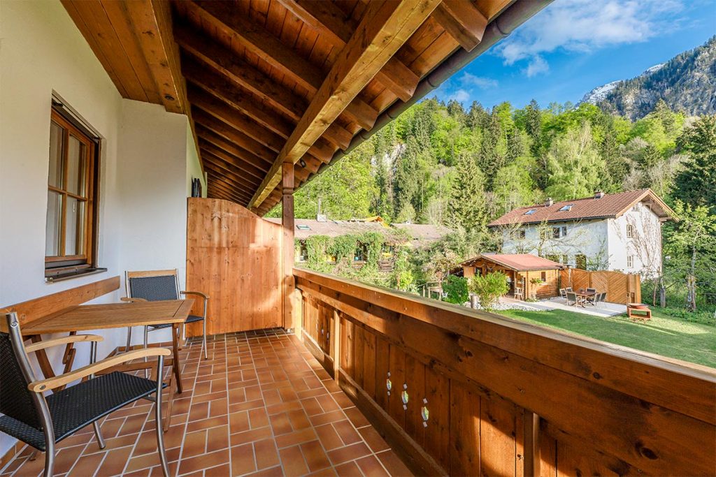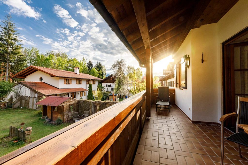 • Süd- und Westbalkon mit überdachtem Freisitz. Sitzgarnitur mit Tischen auf beiden Balkonen.